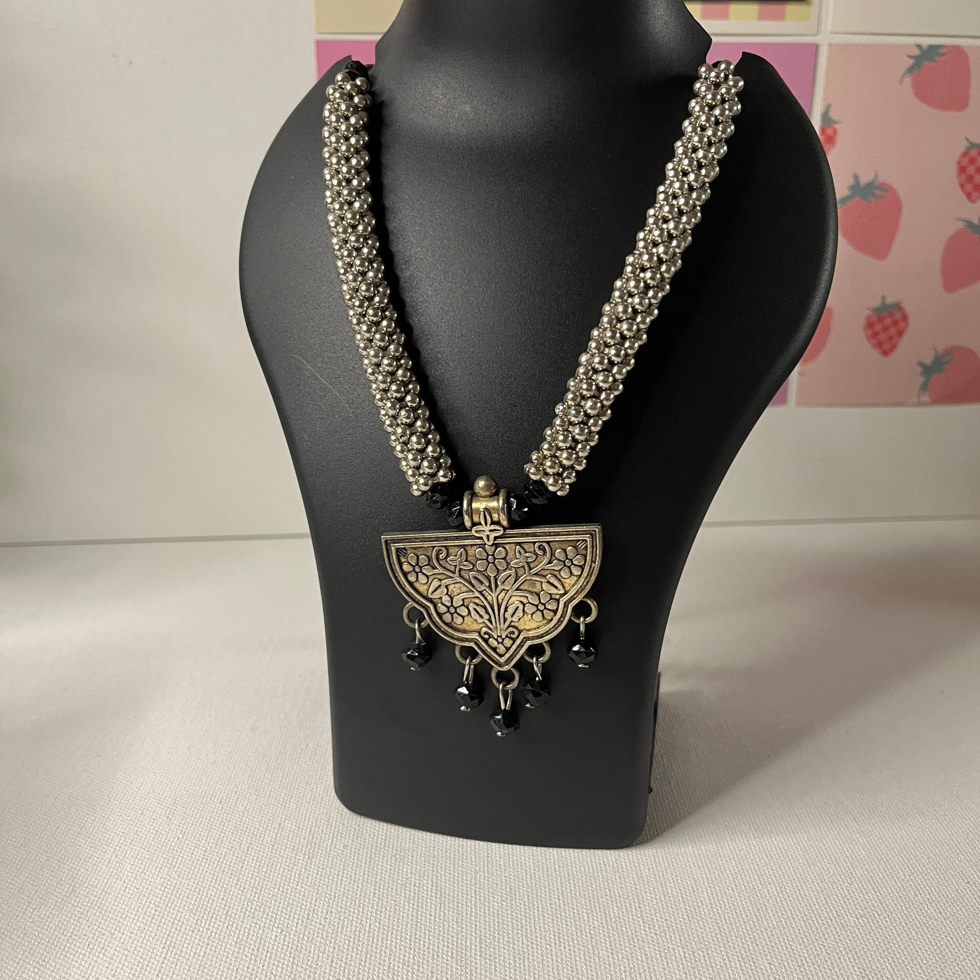 Enhance your outfit with our Oxidised Royal Necklace. The oxidisation process gives this necklace a unique and sophisticated look, perfect for any occasion. Made from high-quality materials, this necklace will add a touch of elegance to your jewelry collection.